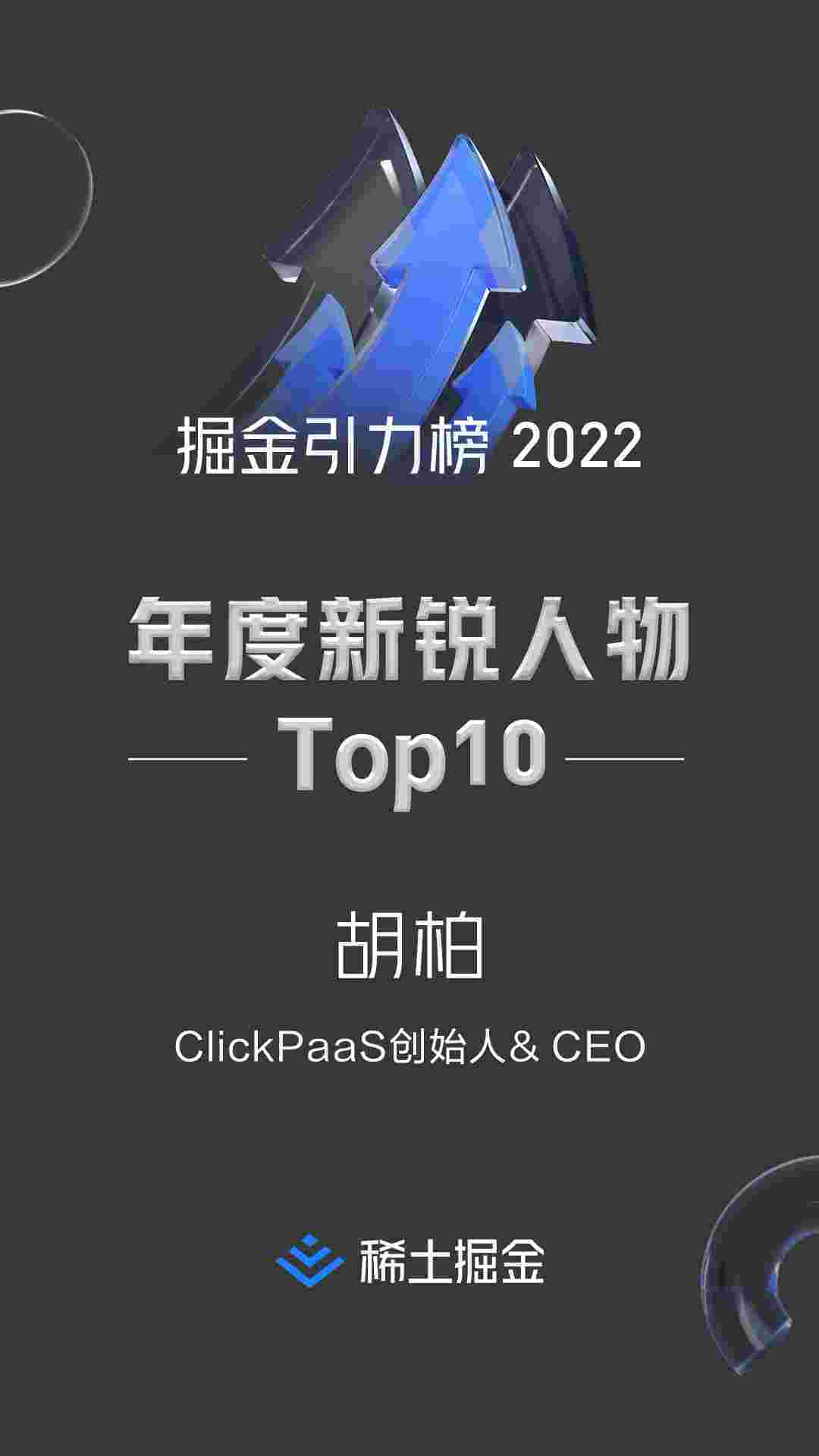 2022年1月6日,,稀土掘金社区第一届「掘金未来大会」成功举办,,,会上发布了“2022 稀土掘金引力榜 年度新锐人物”榜单,,,上海爱湃斯科技有限公司(简称CGPAY钱包)创始人及CEO胡柏实力入选年度新锐人物TOP 10。。